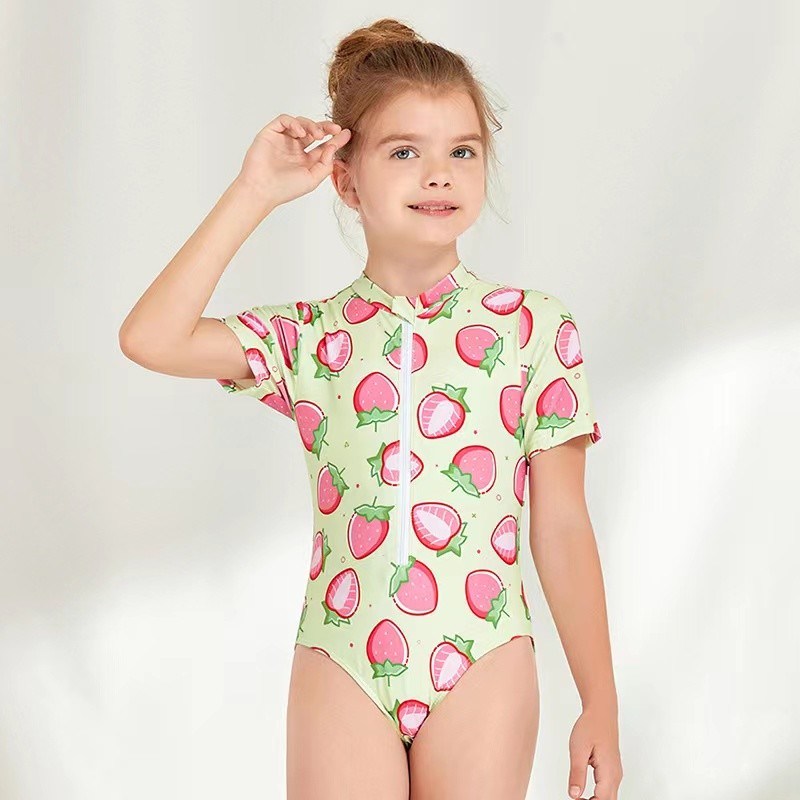 مایو یک تکه بچه گانه مایو دخترانه زیپ دار با چاپ توت فرنگی زیبا